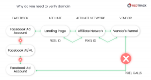 As mentioned above, there is now a requirement to verify domains where conversion event happens. But what do you do if you don’t own this domain? RedTrack offers a solution that helps pass the information from a domain where conversion happens to Facebook Data Source and Facebook Ad Account. All you have to do as third-party advertisers in this case — verify your landing page and RedTrack will take care of the rest. In the picture below, you can see how our technology works.