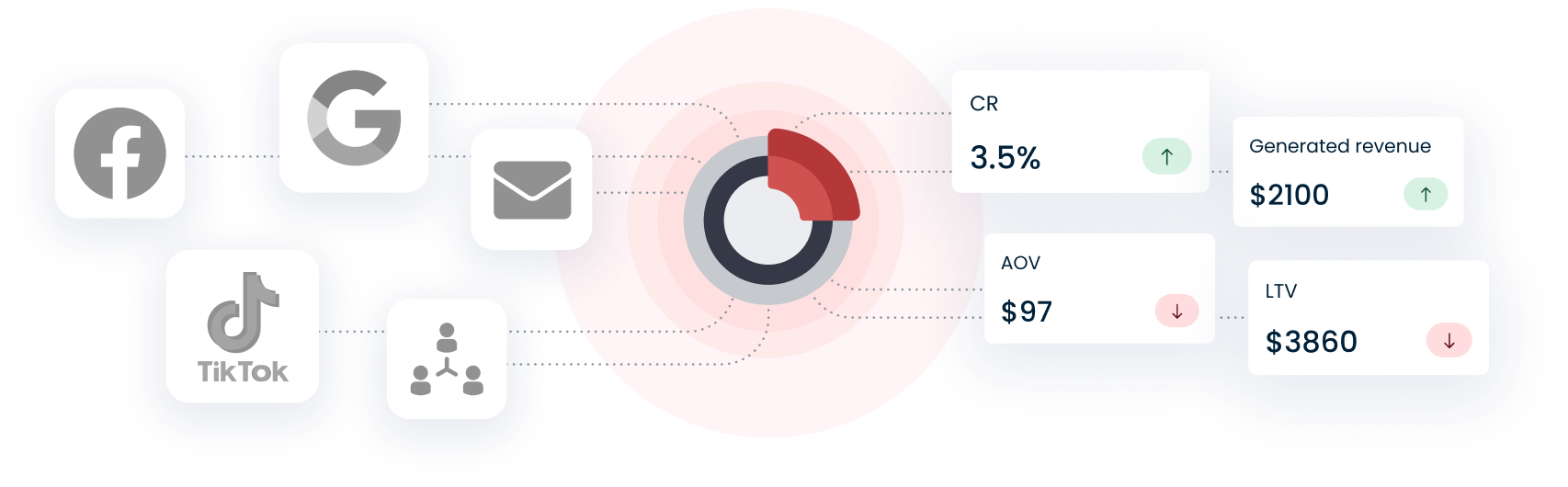 Your marketing team scales the number of channels yet have a hard time identifying value behind them? Track and attribute every sale, while monitoring all the important financial metrics: CPA, Revenue, LTV, AOV, etc. and get a precise unit cost with marketing data included!